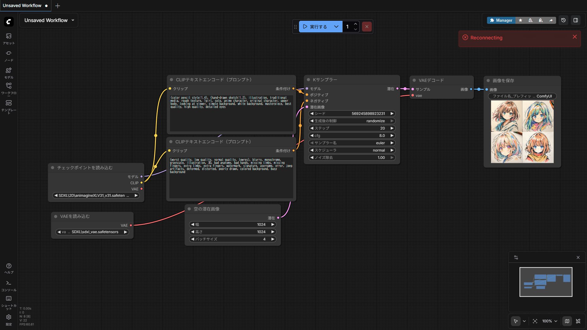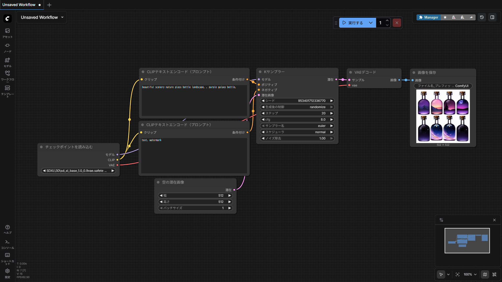 ComfyUIのインターフェースは、画像生成プロセスをノードとラインで接続する「ワークフローベース」が最大の特徴です。各ステップ(ノード)単位での詳細なパラメータ制御が可能となり、複雑な生成処理を視覚的に組み立てられます。