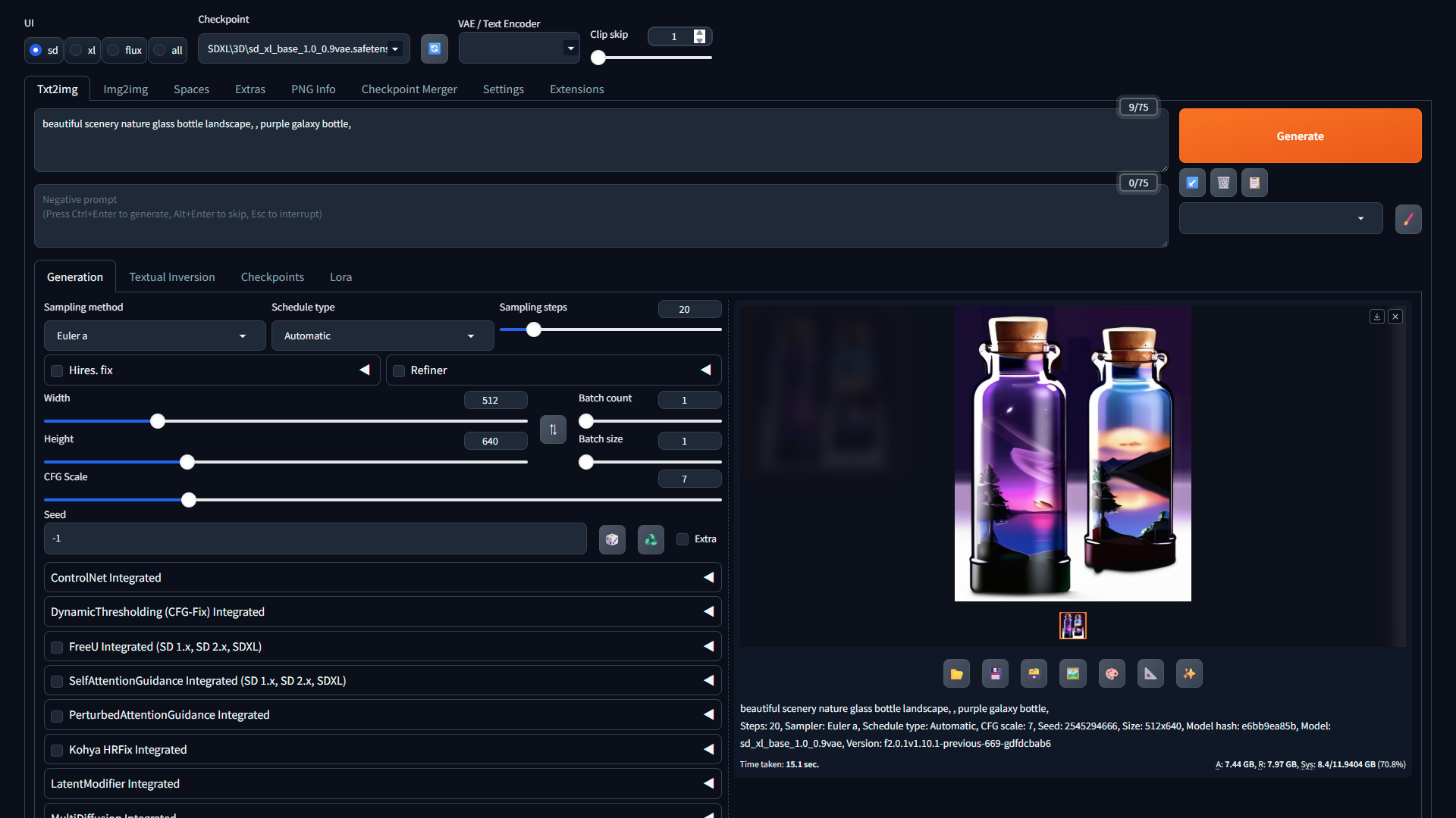 Stable Diffusion WebUI Forgeのインターフェースは、A1111ほぼ同じ画面構成です。しかし、イメージ生成時のVRAMの使用効率や処理速度の面が最適化されていて、同じような操作感でも高負荷な機能を使用する際の軽さと高速性に優れています。