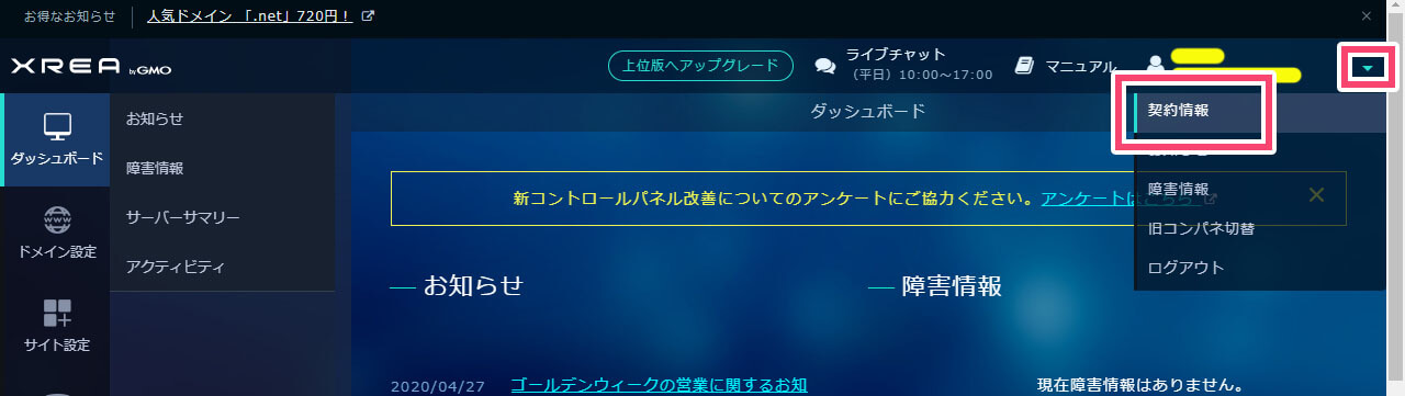ここから XREA のコントロールパネル操作になりますが、右上にあるユーザー情報をクリックし、表示されるメニューから「契約情報」を選択。