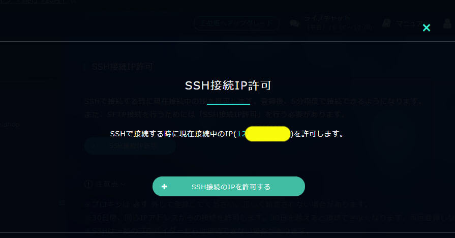 すると、接続中のIPアドレスにSSH接続を許可する旨の表示が出るので、「SSH接続のIPを許可する」をクリック。