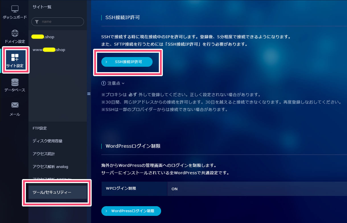 XREA のコントロールパネルから、「サイト設定」→「ツール/セキュリティー」→「SSH接続IP許可」を選択します。