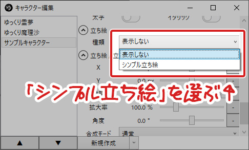 「立ち絵」の「種類」を「シンプル立ち絵」にする。